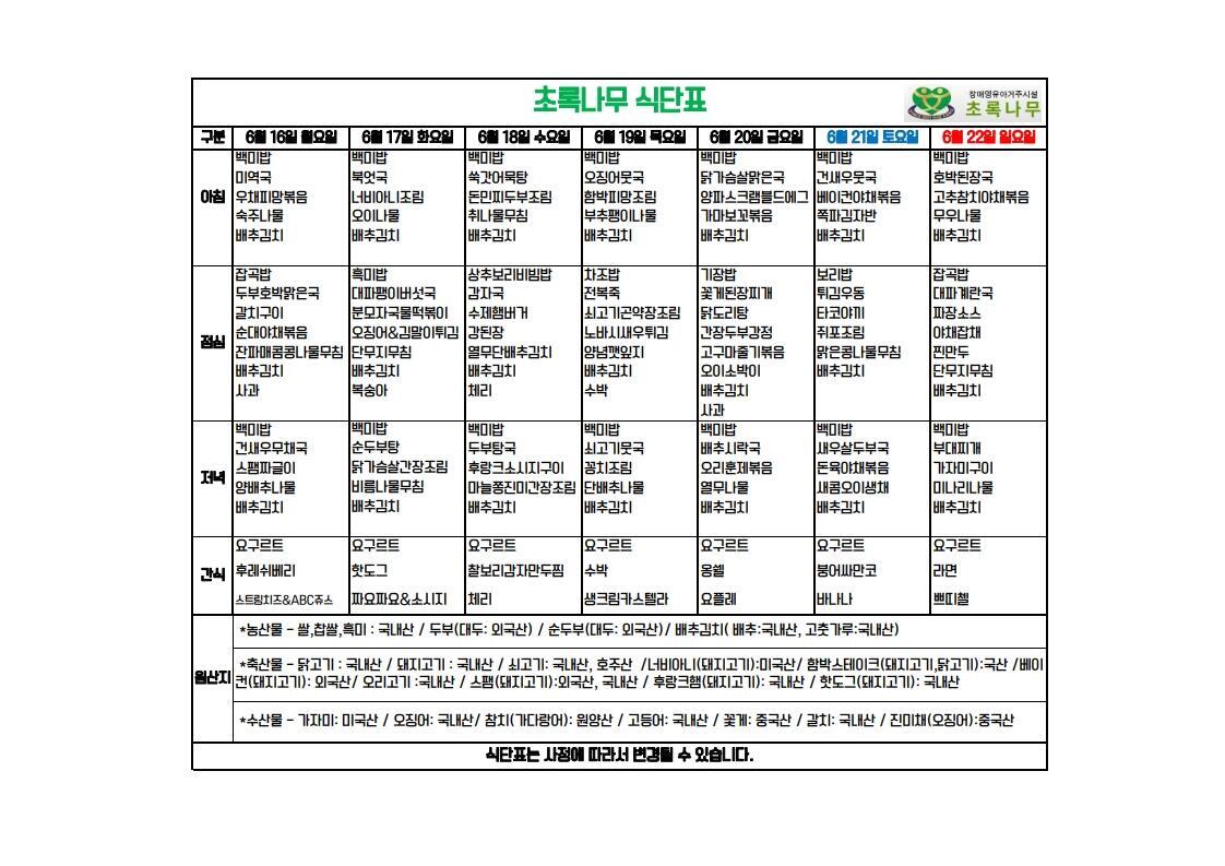 2025년 6월 3주 식단표