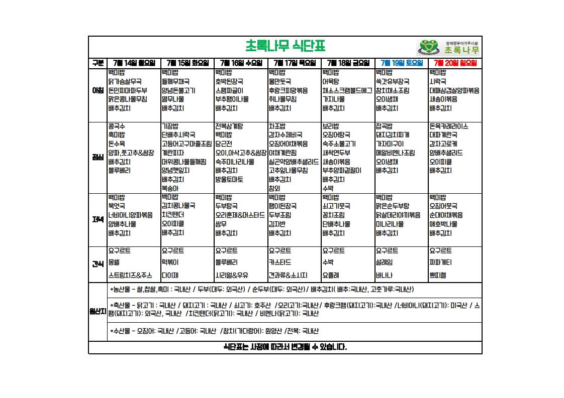 2025년 7월 2주 식단표