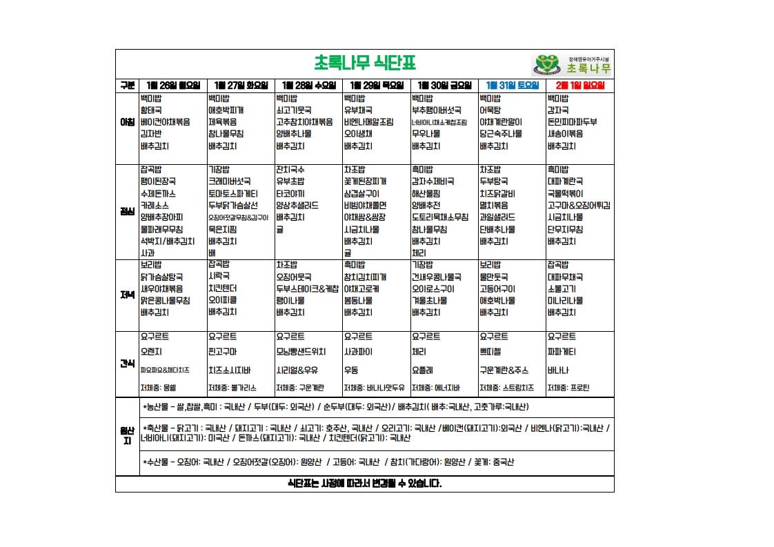 2026년 1월 4주 식단표