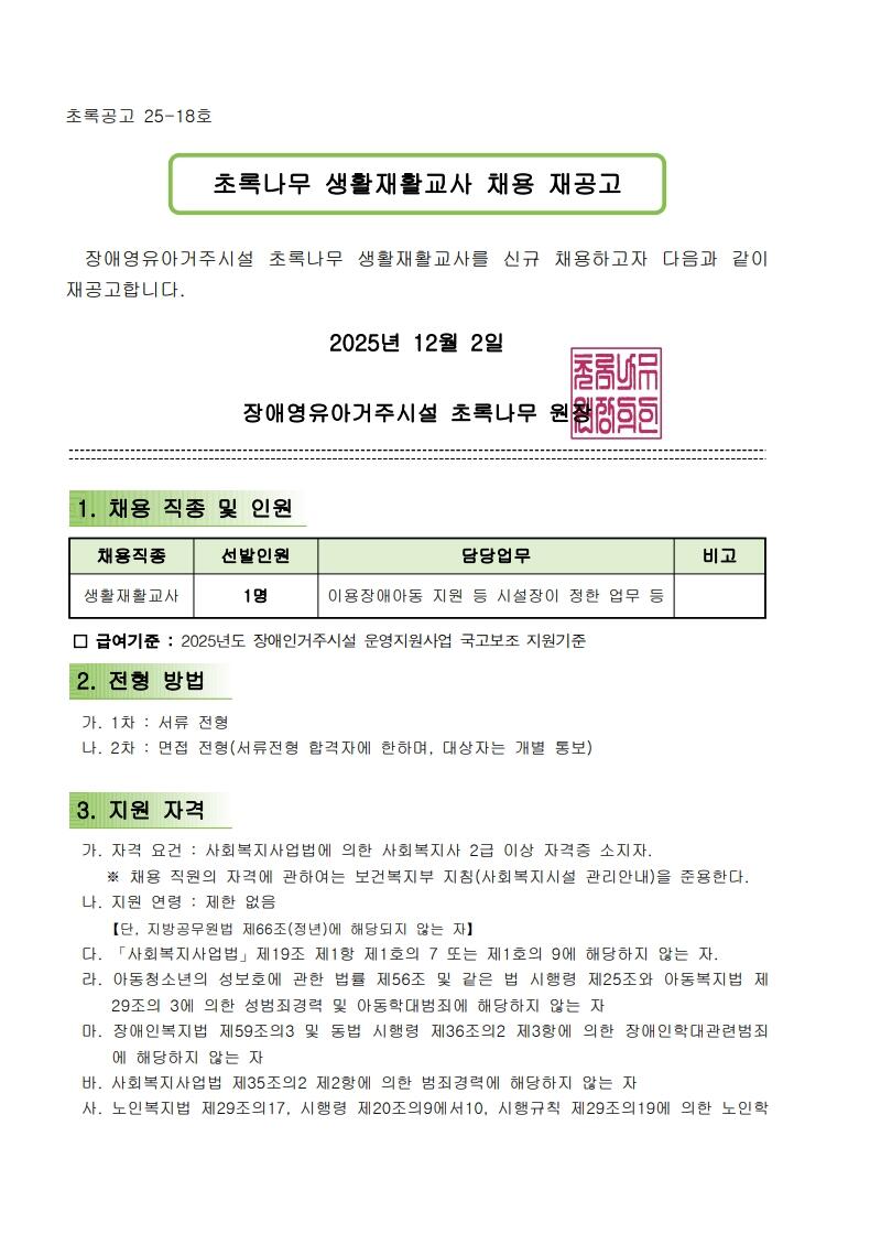생활재활교사 채용 공고